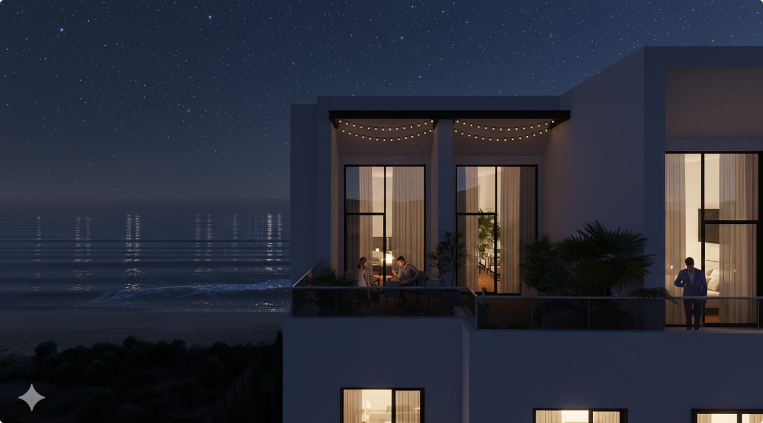 Здания «спускаются» к морю террасами, поэтому значительная часть апартаментов имеет прямой или боковой вид на воду.